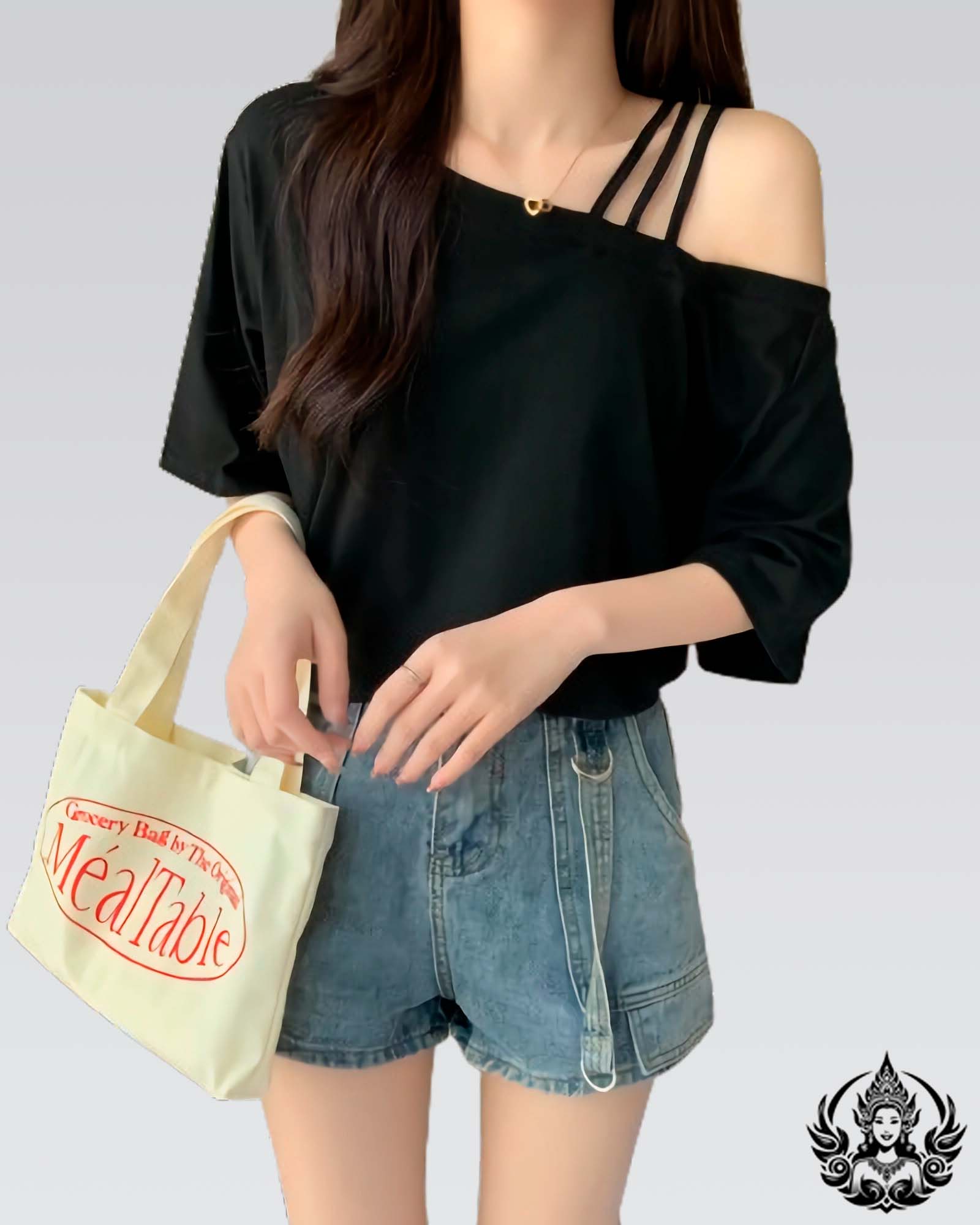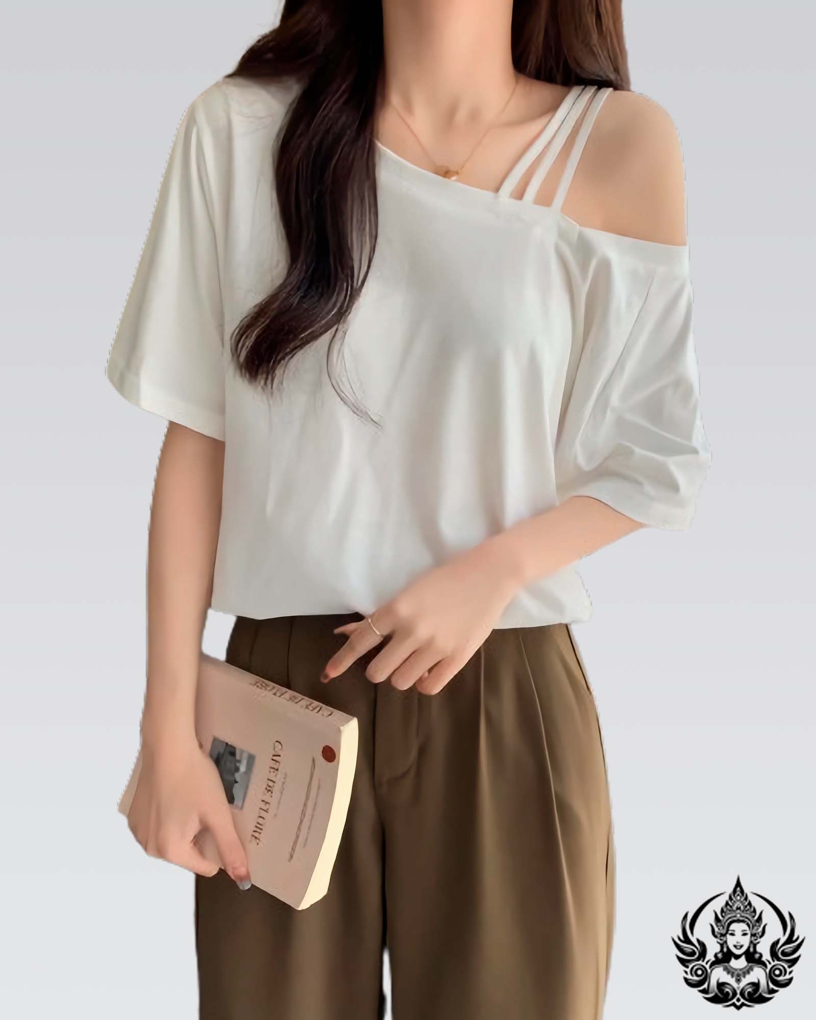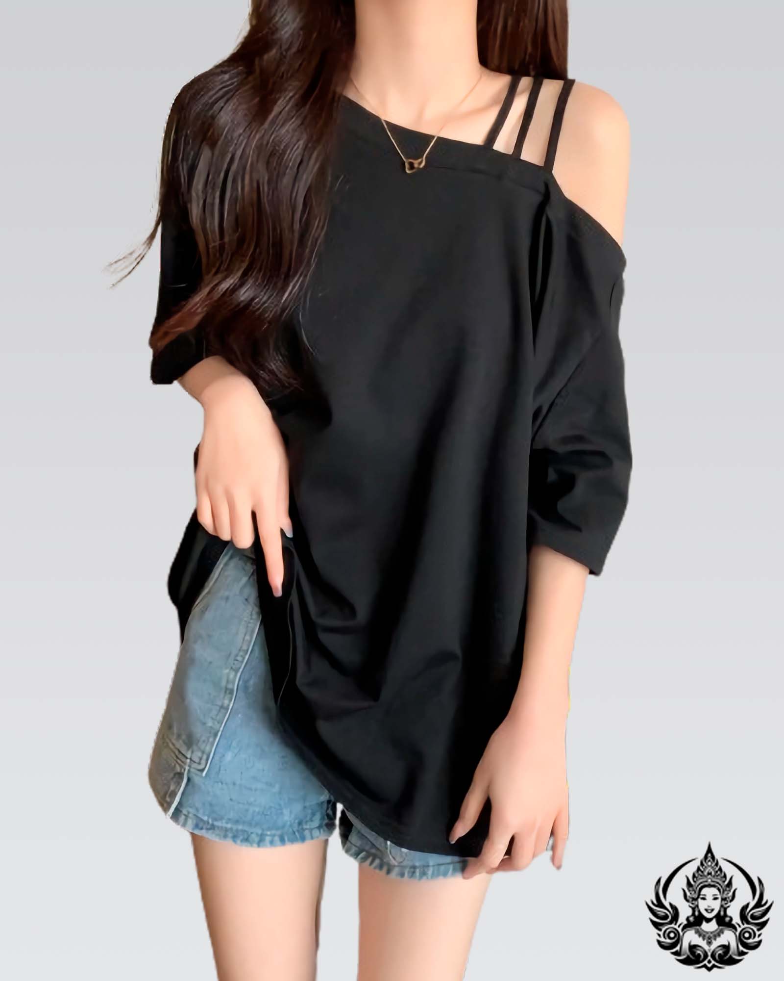 Blusa de manga corta en talla grande. El cuello está cortado en líneas. Cuello ancho, hombros abiertos, decorado con cadena, moda coreana.