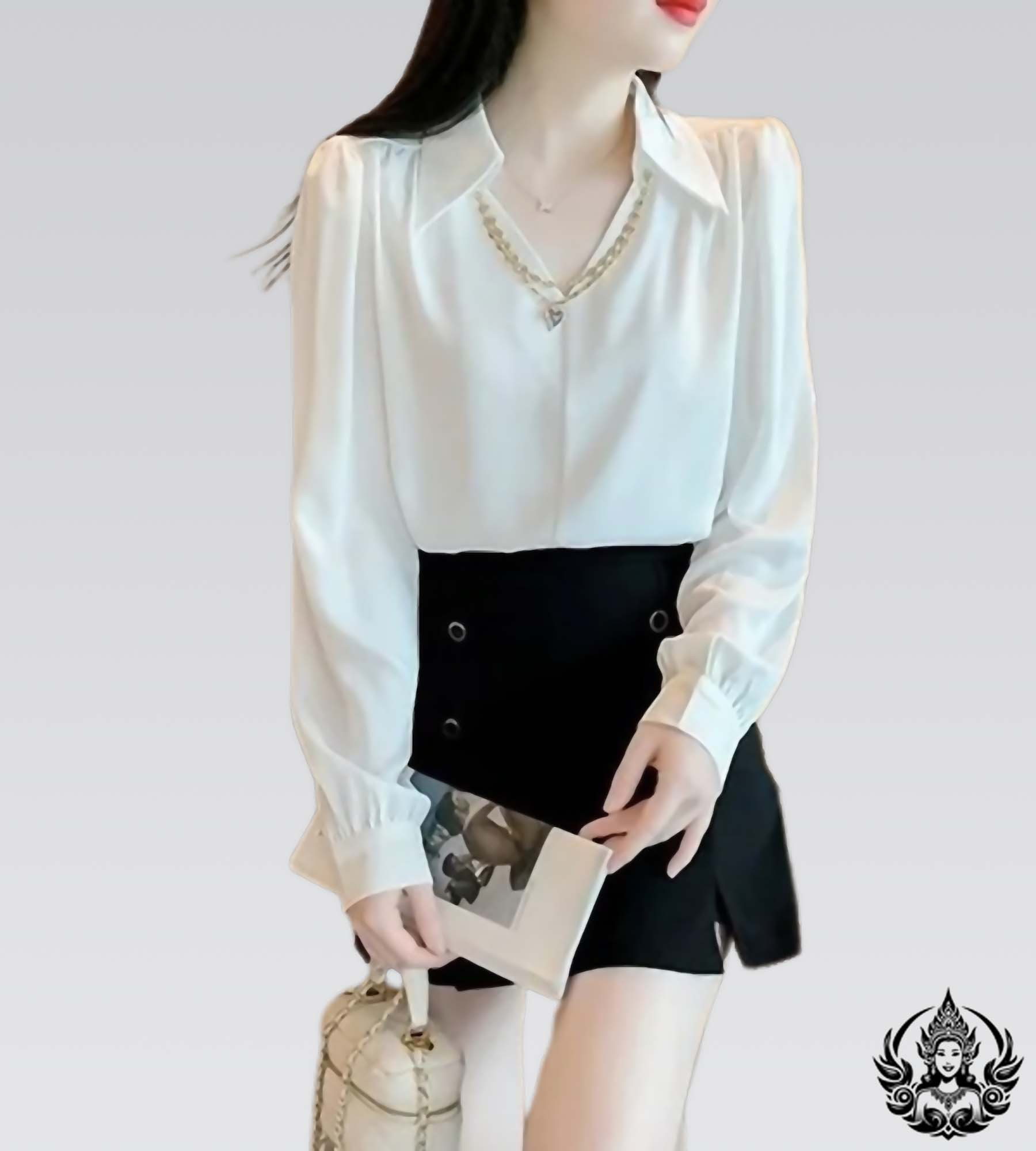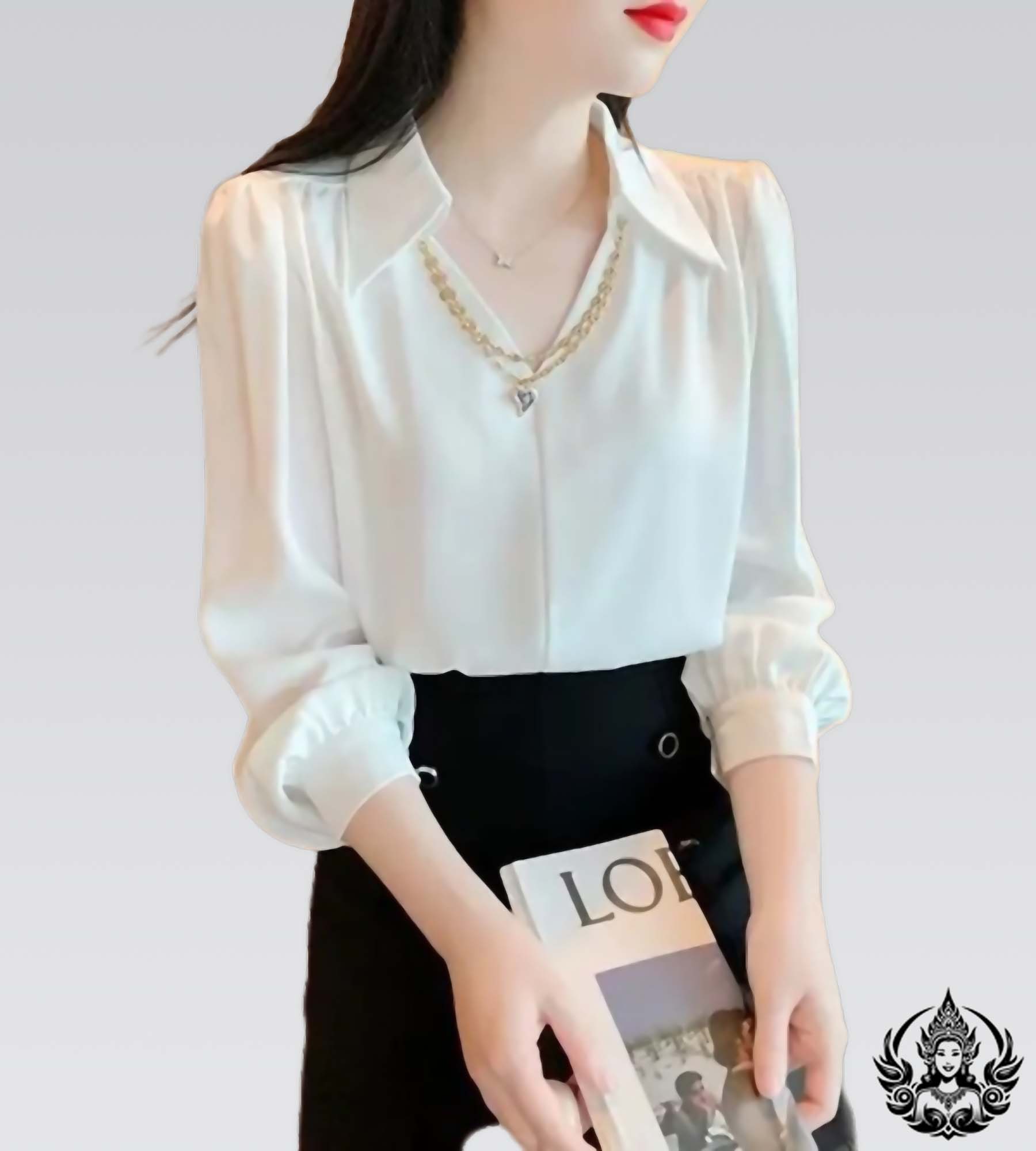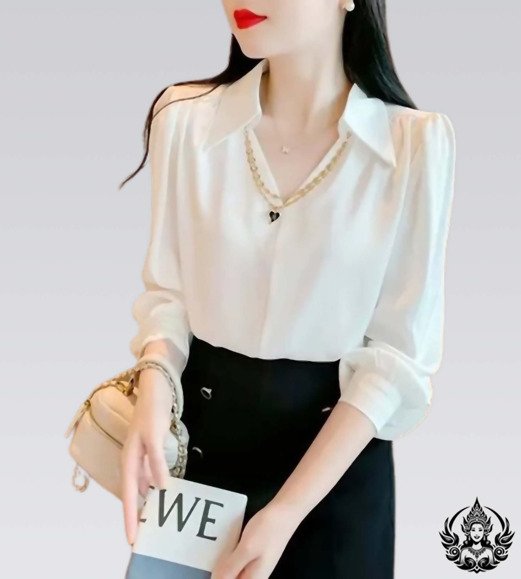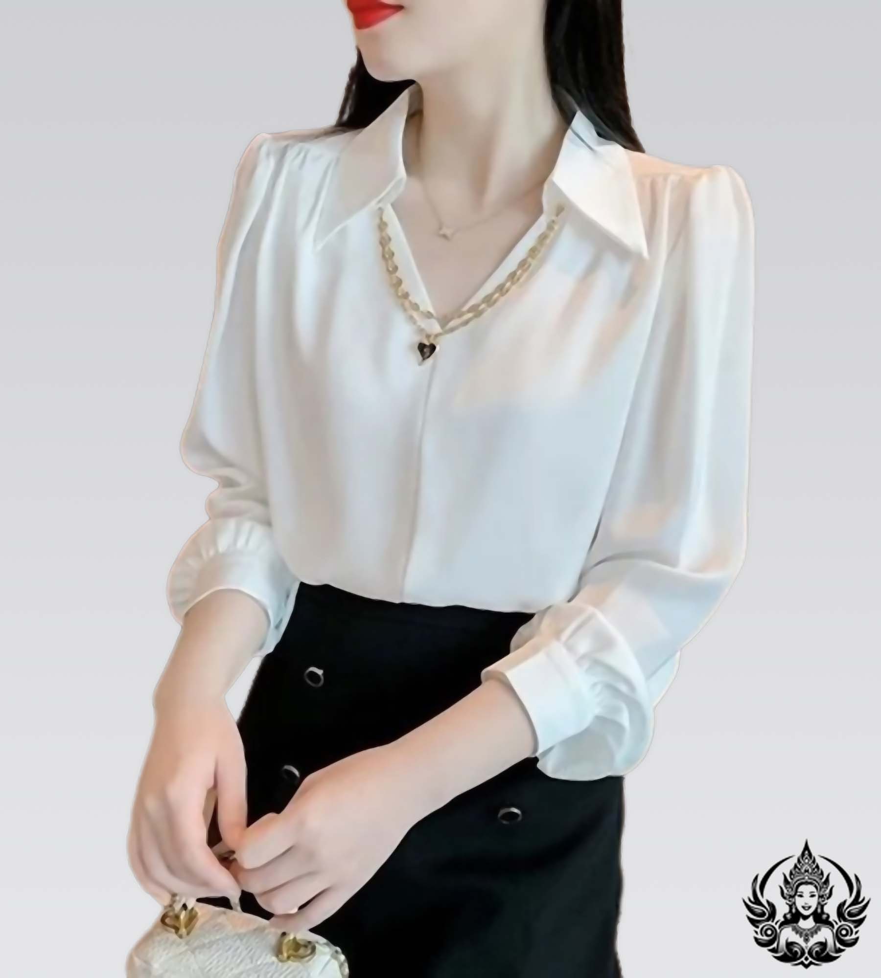 Blusa de manga larga para mujer. Hay una cadena unida al cuello de una camisa de trabajo, tela coreana, cómoda de usar (la real no tiene corazón en la cadena).