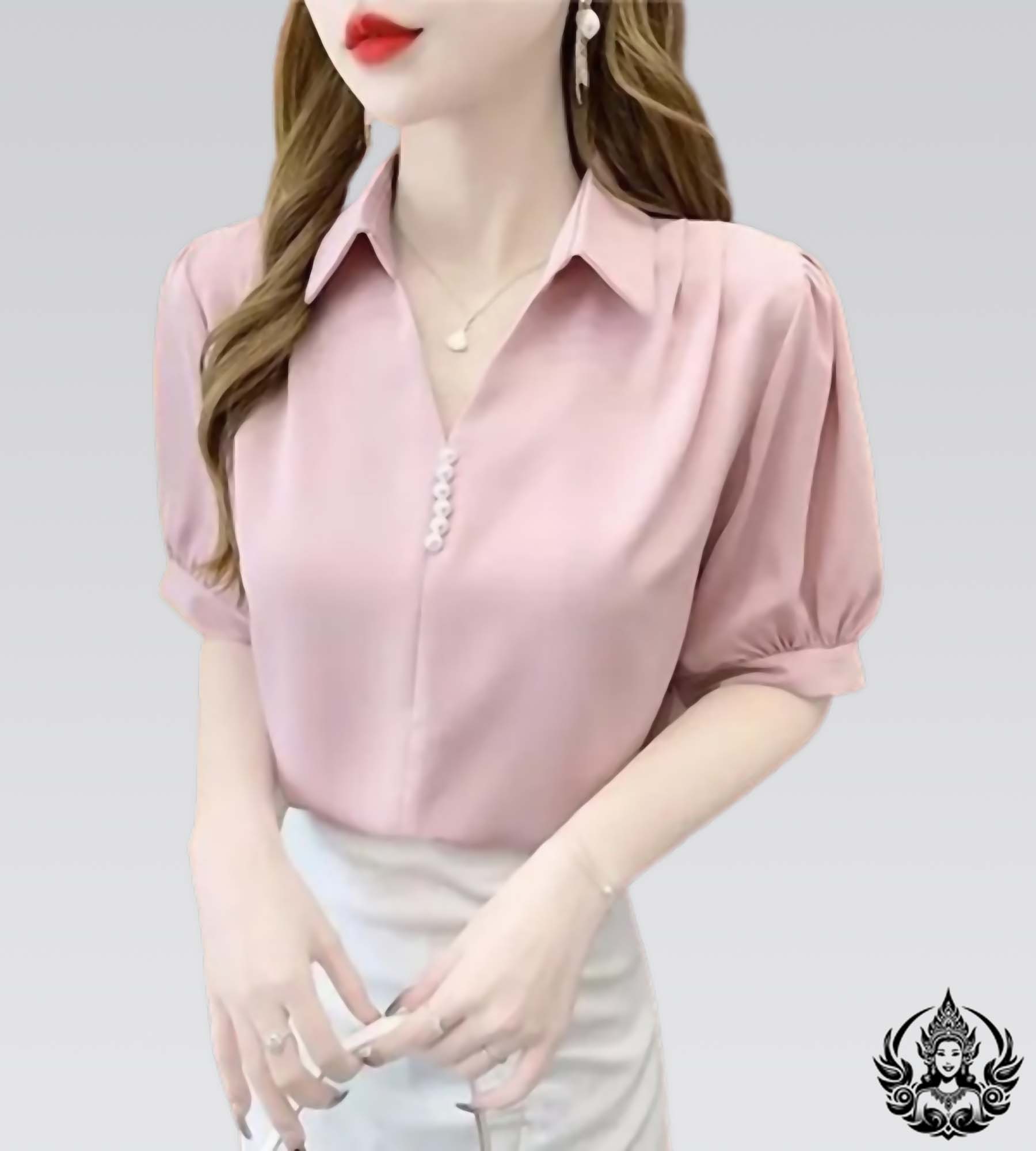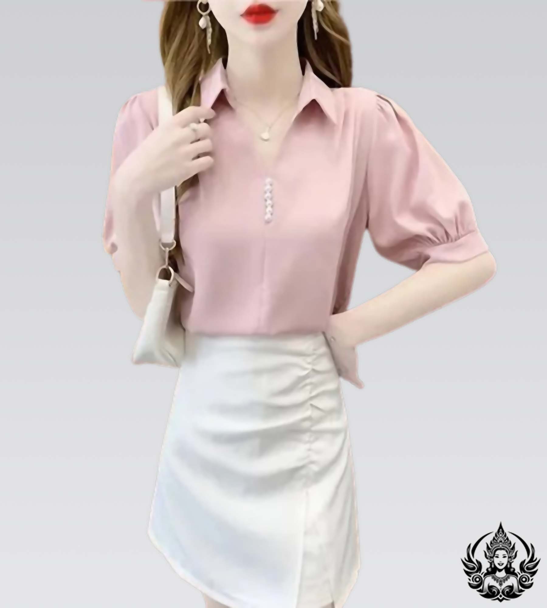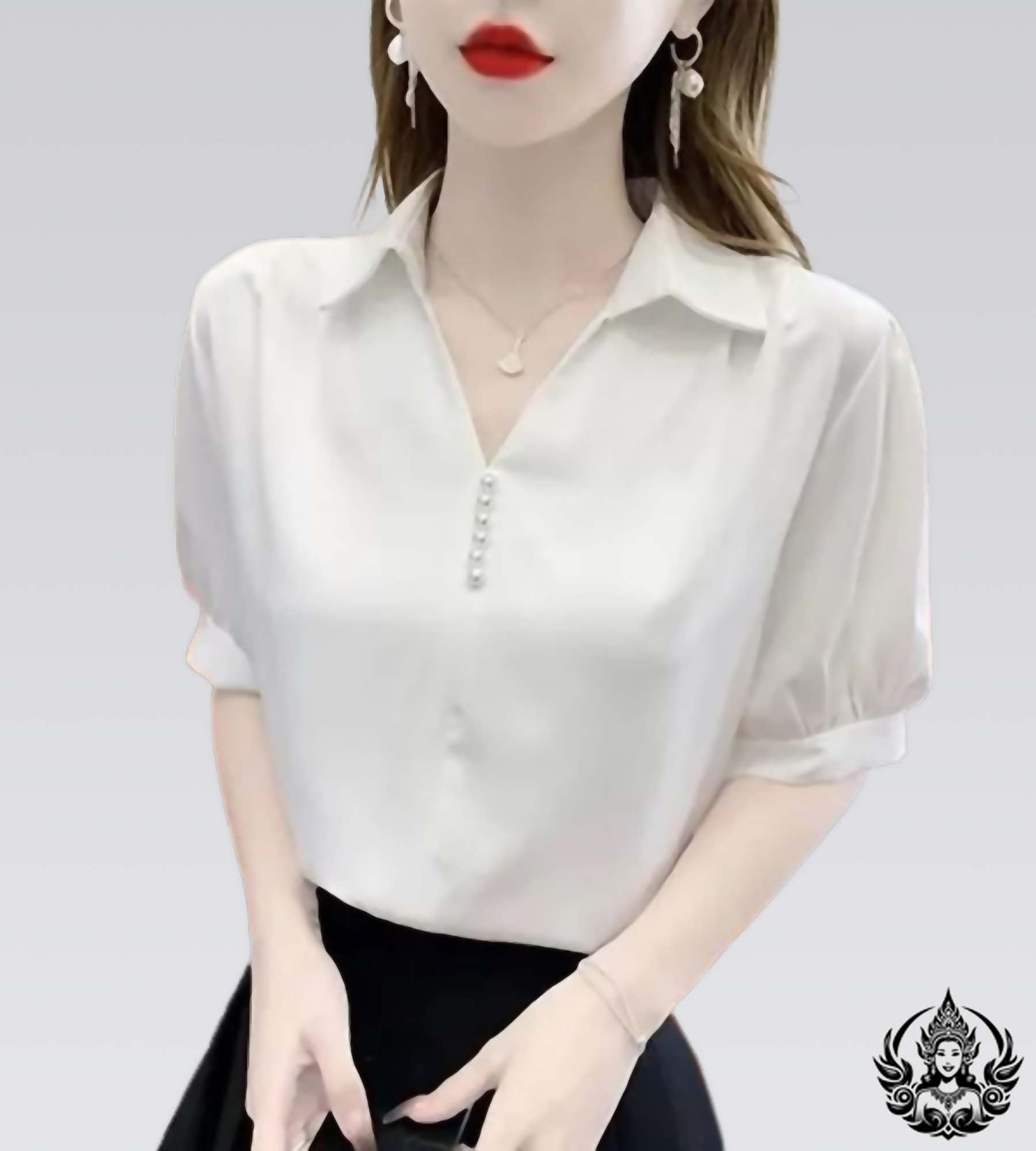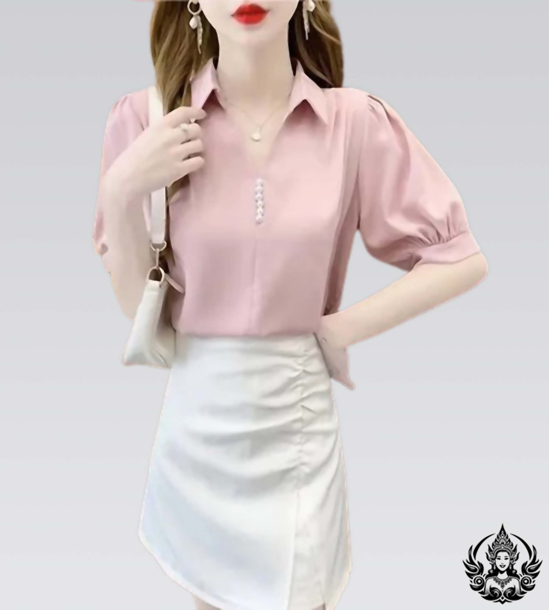 Versión coreana de la blusa femenina de manga corta con cuello decorado con 8 perlas de colores.