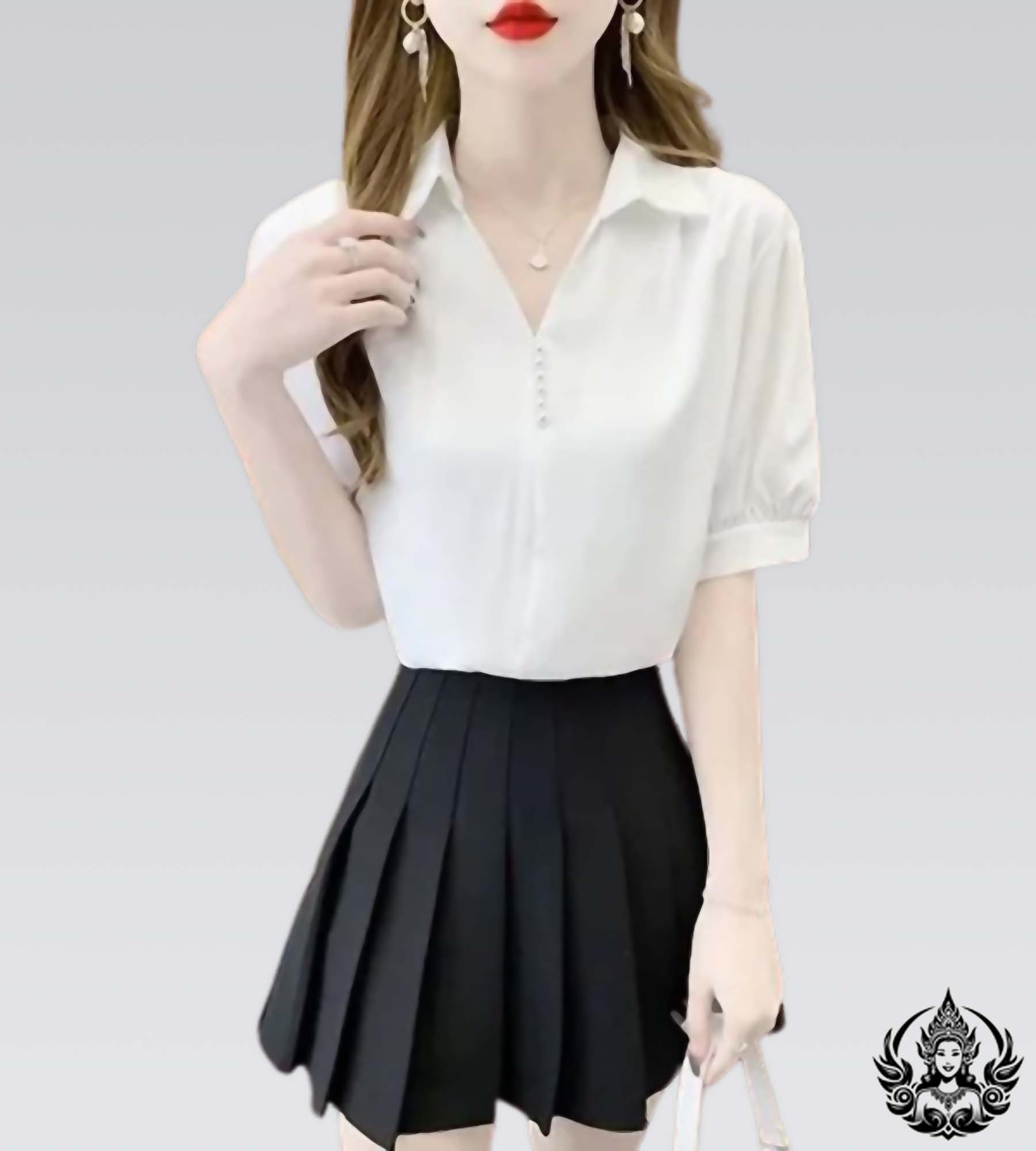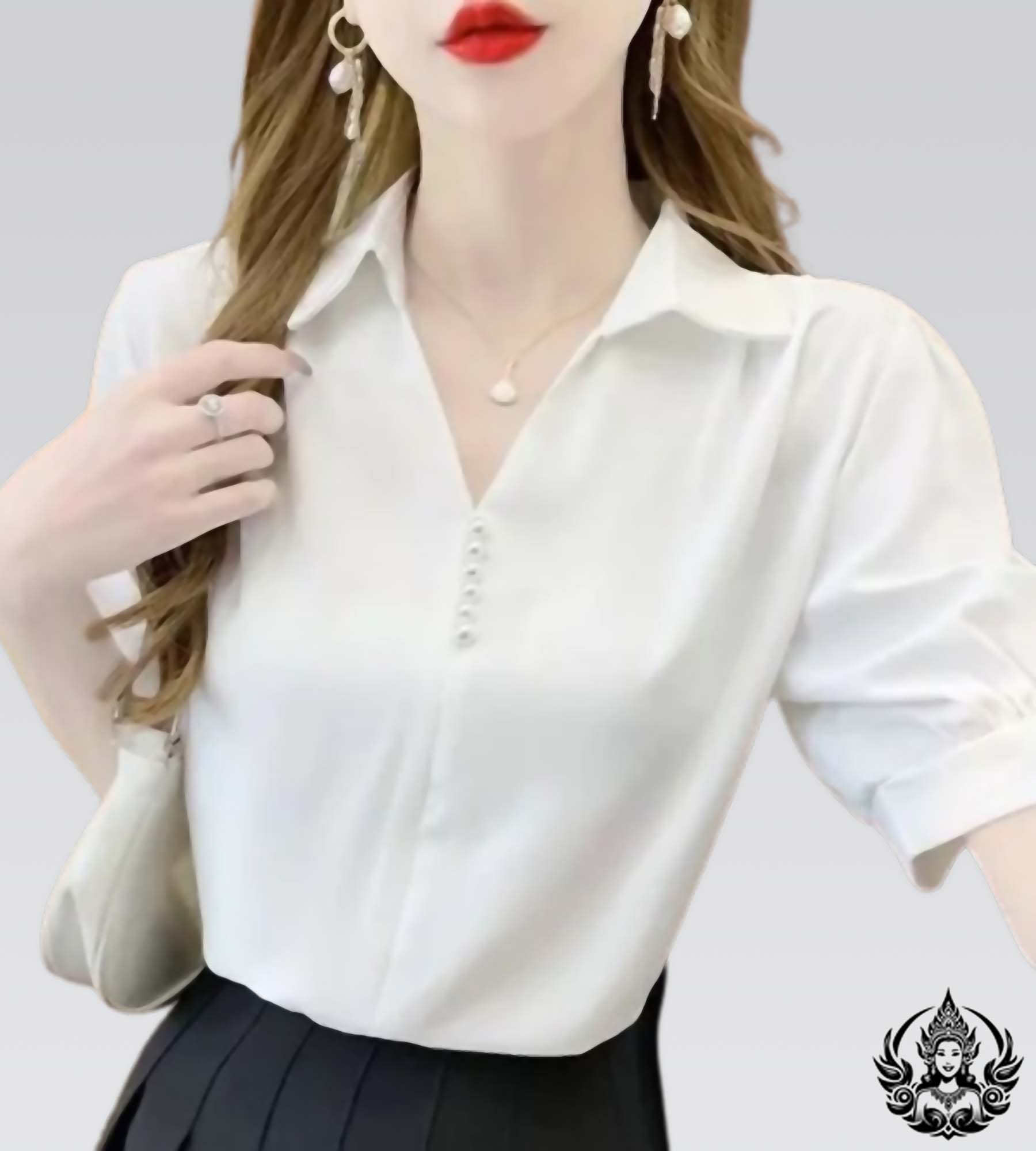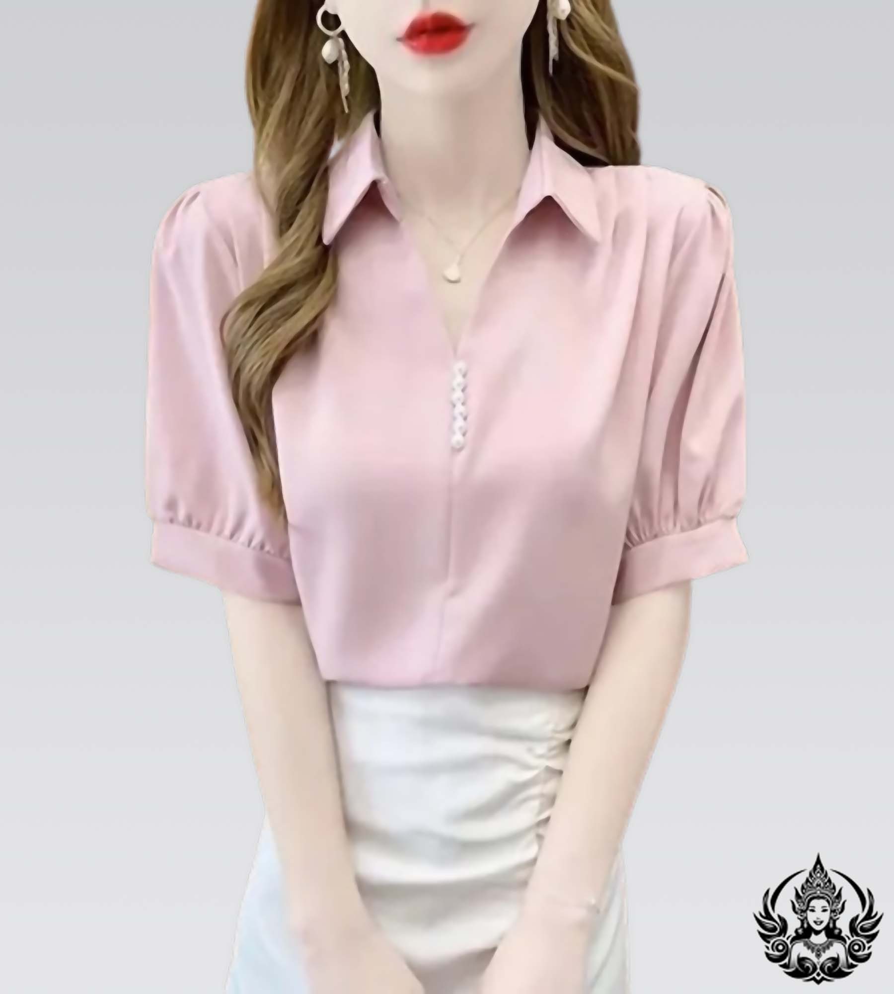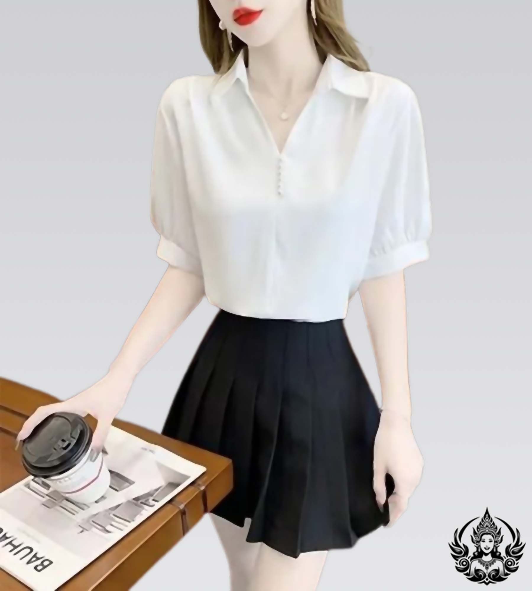 Versión coreana de la blusa femenina de manga corta con cuello decorado con 8 perlas de colores.